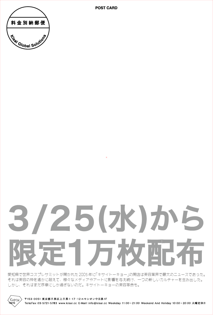 2015.03.20 NEWS 3/25(水) 10周年 3/25(水)で kisaiTOKYO美容院も、10年を迎えます。 今回は10周年記念として スタッフの甘い歌声のCDを作成してみました。 明日21(土曜)より配布しておりますのでお待ちしております 目黒区の美容室 kisaiTOKYO PREVALLNEXT NEWS新着情報 2025.11.10 年末年始のお知らせ 2025.04.10 大切なお知らせ 2024.11.21 冬季休業のお知らせ 2023.10.23 価格改定のお知らせ MORE